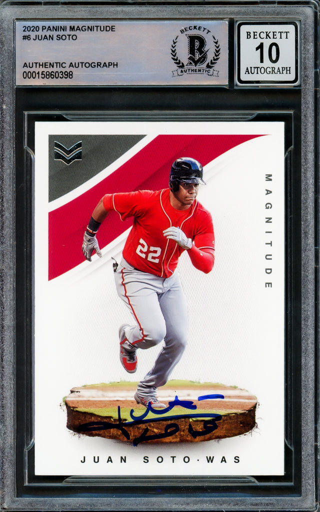 Own a piece of baseball history with this 2020 Panini Magnitude Card #6, hand-signed by superstar Juan Soto. A rising legend in Major League Baseball, Soto's signature has been professionally authenticated and graded Gem Mint 10 by Beckett Authentication Services (BAS), ensuring both authenticity and pristine quality. This rare collectible is securely encapsulated in Beckett's tamper-proof holder, preserving its value for years to come.