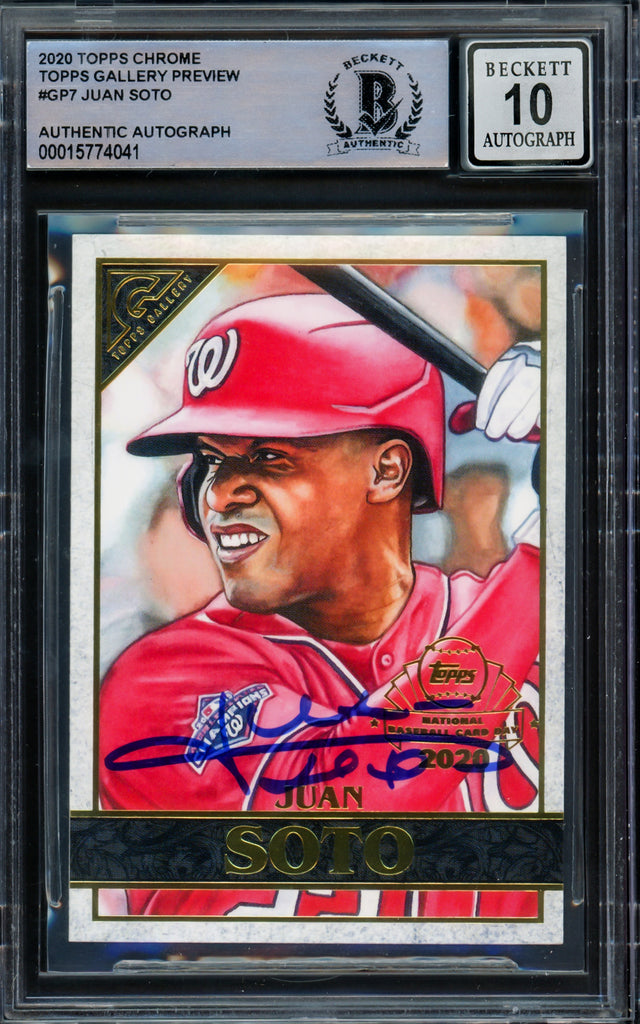 Own a piece of baseball history with this 2020 Topps Gallery National Baseball Card Day Card #GP-7, hand-signed by Juan Soto—one of the most exciting young stars in the game. This collectible features an authentic signature graded Gem Mint 10 by Beckett BAS, ensuring pristine quality and value for serious collectors.