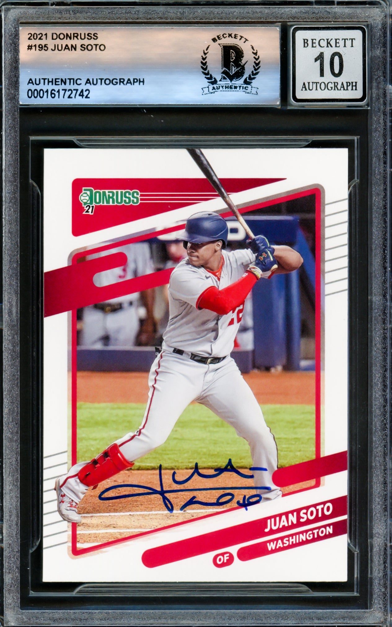 Juan Soto Autographed 2021 Donruss Card #195 New York Mets Auto Grade Gem Mint 10 Beckett BAS #16172742