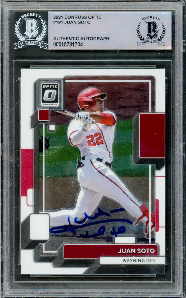 Own a piece of baseball history with this 2021 Donruss Optic Card #191, hand-signed by Juan Soto—one of the game's brightest stars. This highly collectible card is certified authentic by Beckett Authentication Services (BAS) and comes securely encapsulated in their tamper-proof holder, ensuring long-term preservation.