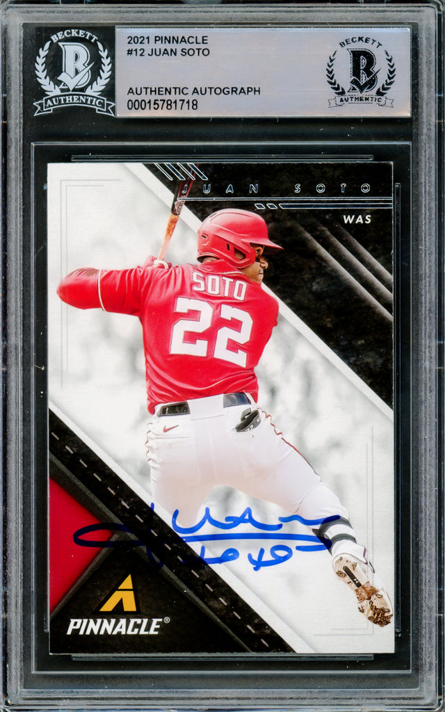 Own a piece of baseball history with this 2021 Panini Chronicles Pinnacle Card #12, personally hand-signed by Juan Soto. As one of the most electrifying talents in the game, Soto's autograph makes this card a must-have for collectors and fans alike. This rare collectible has been certified authentic by Beckett Authentication Services (BAS) and comes securely encapsulated in their tamper-proof holder, ensuring its lasting value and preservation.