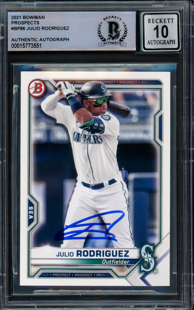 Own a piece of baseball history with this 2021 Bowman Rookie Card #BP86, hand-signed by rising MLB superstar Julio Rodríguez. This coveted rookie card has been graded Gem Mint 10 for its autograph by Beckett Authentication Services (BAS), ensuring top-tier quality and authenticity. Encapsulated in Beckett's tamper-proof holder, this collectible is perfect for serious investors and passionate fans alike.