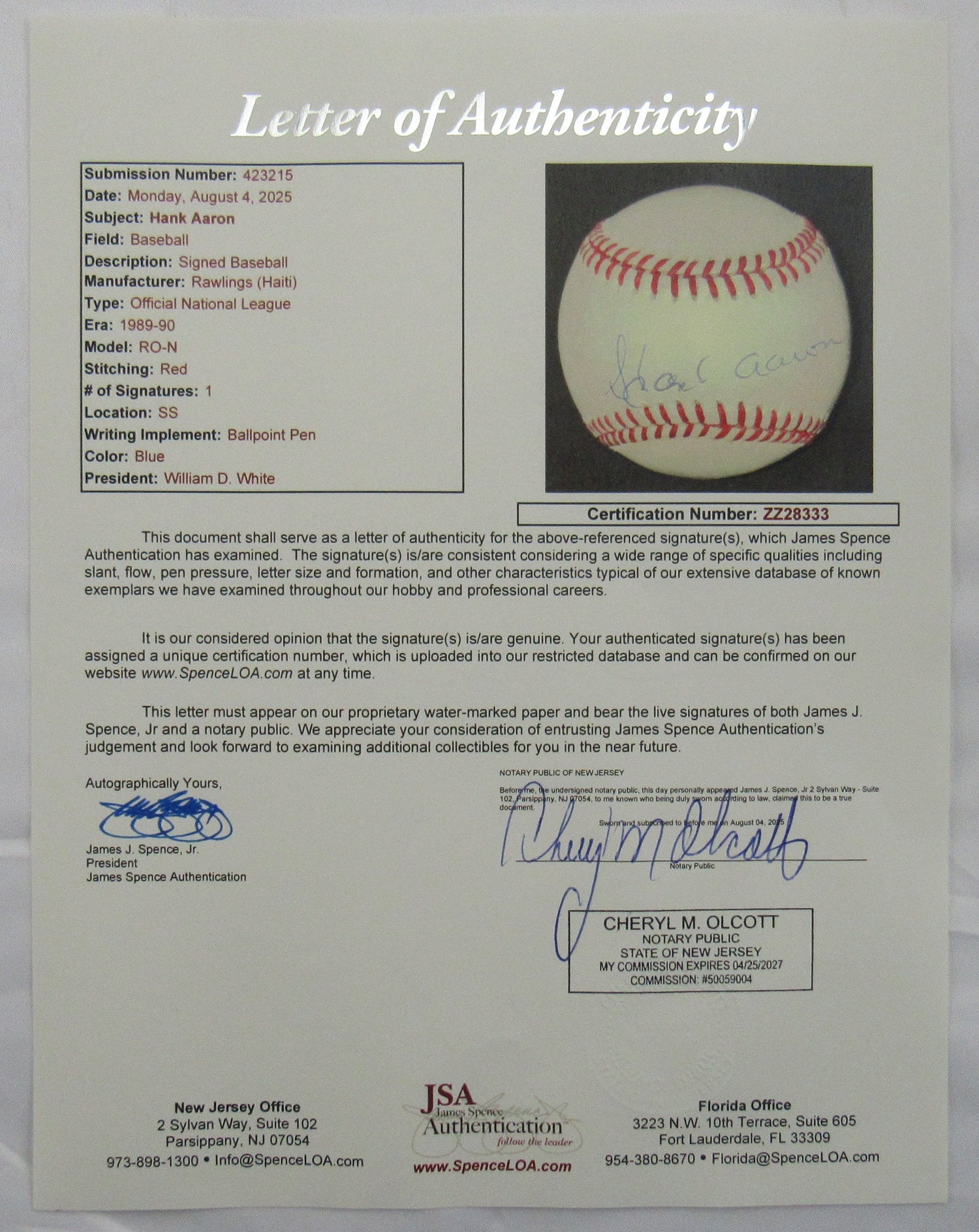 Hank Aaron Signed Auto Baseball JSA LOA ZZ28333 is backordered and will ship as soon as it is back in stock.