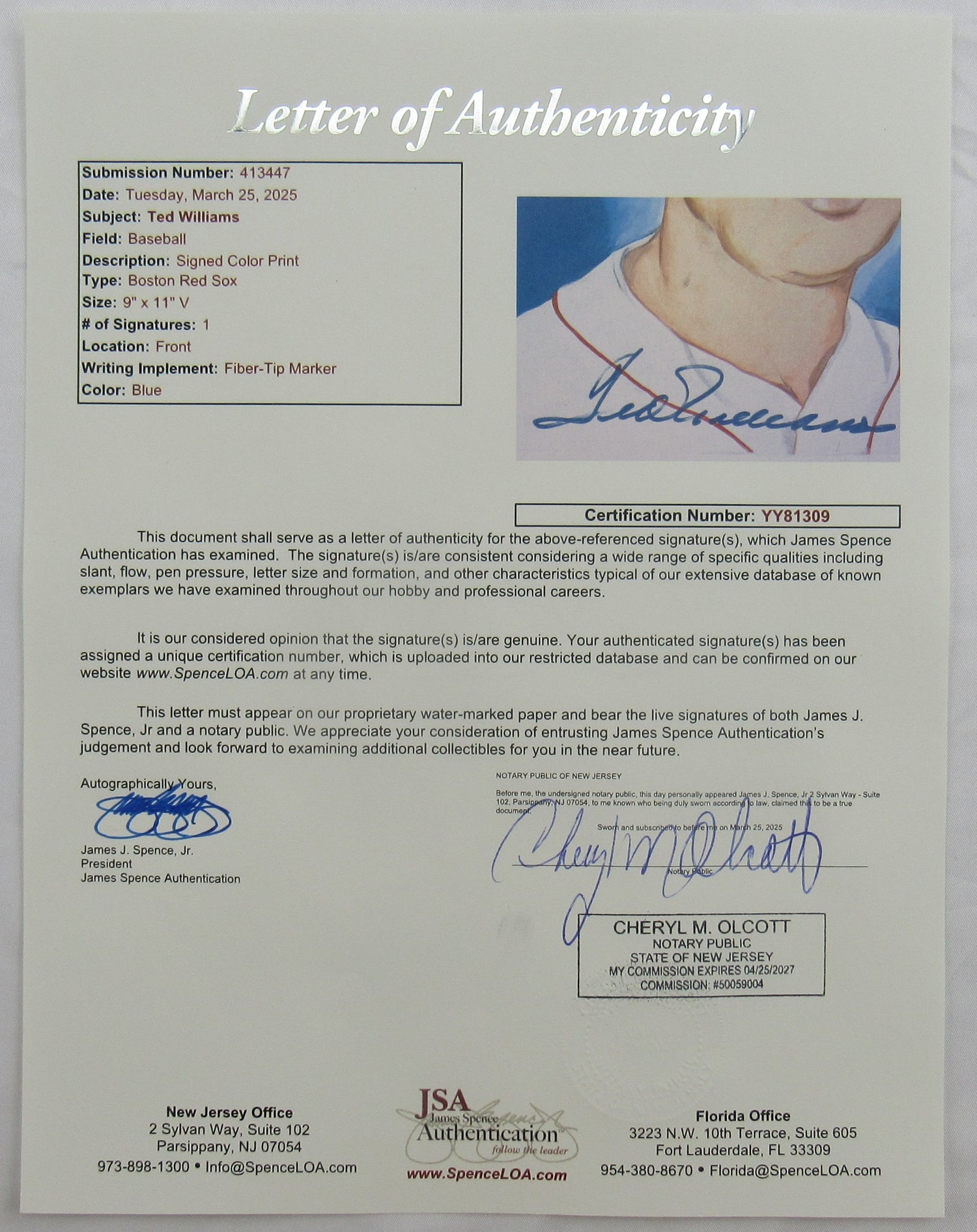- Authentic Ted Williams autograph — clear, bold signature on high-quality 9x11 print