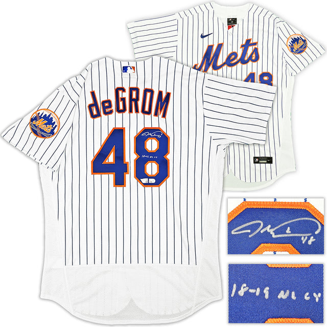 Own a piece of New York Mets history with this White Nike Authentic Jersey, hand-signed by Jacob deGrom. A must-have for serious collectors and Mets fans alike, this jersey celebrates deGrom’s dominance on the mound, highlighted by his back-to-back National League Cy Young Awards in 2018 and 2019.