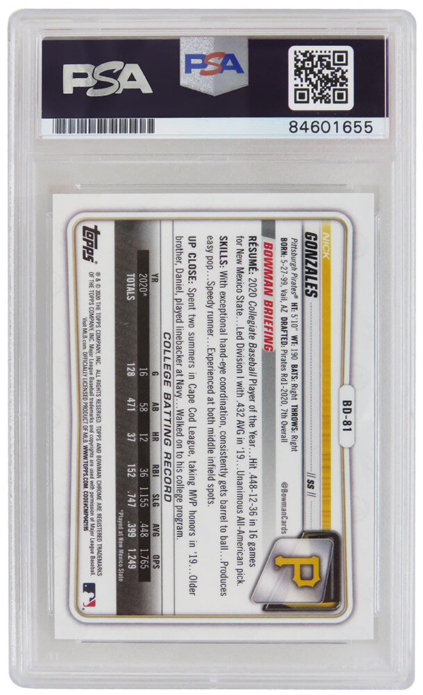 Nick Gonzales Signed Pittsburgh Pirates 2020 Topps Bowman Chrome Baseball Rookie Card #BD-81 (PSA/DNA - Auto Grade 10)