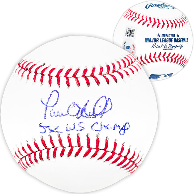 This Official MLB Baseball has been hand-signed by Paul O’Neill and features the special inscription "5x WS Champs", celebrating his five-time World Series Championship victories. A must-have collectible for New York Yankees fans and baseball memorabilia enthusiasts, this autographed baseball honors one of the most celebrated players in Yankees history.
