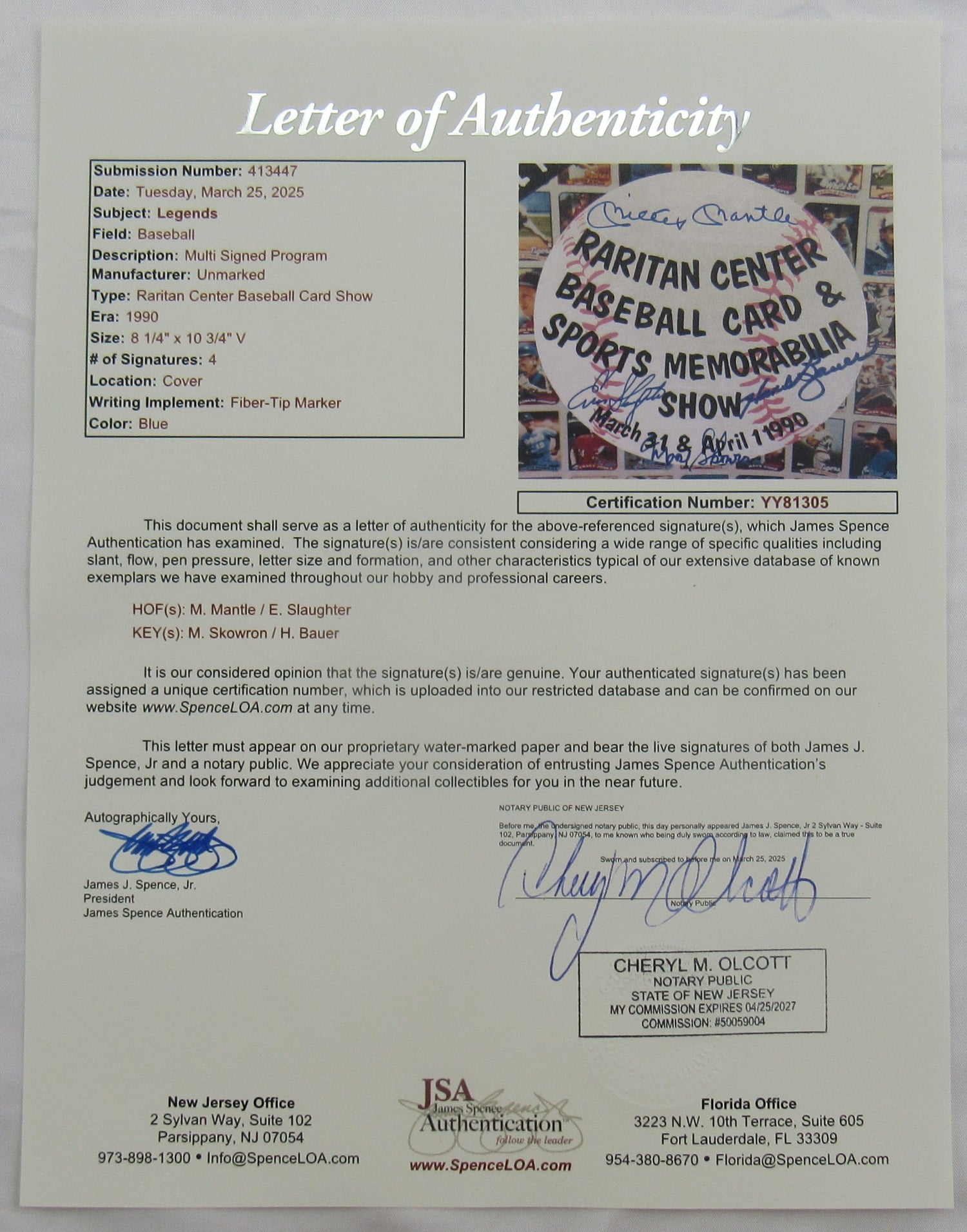 Own a rare and iconic piece of New York Yankees history with this signed magazine program autographed by Mickey Mantle, Moose Skowron, Hank Bauer, and Enos Slaughter. Each of these legendary players helped shape the Yankees’ dynasty during one of the most thrilling eras in Major League Baseball. This is more than memorabilia—it's a tangible connection to the greatness of the game during the 1950s and 1960s, including contributors to the 1961 World Series Champions team. Authenticated with a JSA Letter of Authenticity (LOA #YY81305), this item is a must-have for serious collectors of vintage baseball relics and Yankees fans alike.