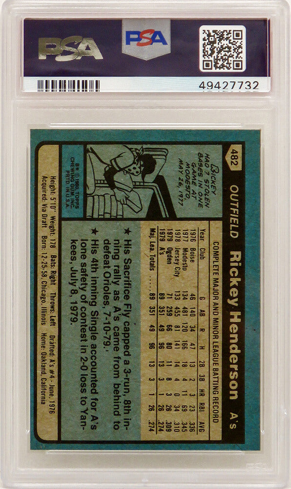 Rickey Henderson (Oakland A's) 1980 Topps Baseball #482 RC Rookie Card - PSA 8 NM-MT (C)