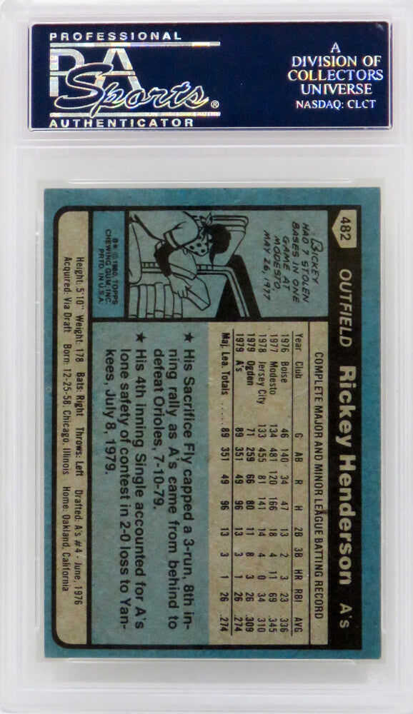 Rickey Henderson (Oakland A's) 1980 Topps Baseball #482 RC Rookie Card - PSA 8 NM-MT (F)