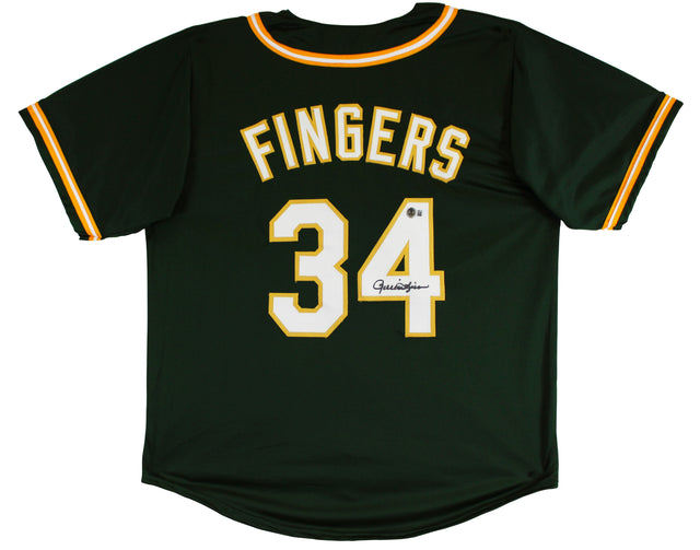 Celebrate a piece of baseball history with this Autographed Green Pro Style Jersey, personally signed by Rollie Fingers of the Oakland Athletics. A legendary Hall of Fame closer known for his trademark mustache and dominance on the mound during the 1970s and early '80s, Rollie Fingers helped the A's secure three consecutive World Series titles from 1972 to 1974 and was named the 1981 AL MVP and Cy Young Award winner. This signed jersey is a must-have collectible for fans of Oakland Athletics history and MLB memorabilia collectors alike. Professionally authenticated by Beckett Authentication Services, you can display this piece with total confidence in its legitimacy and provenance. Here's why it belongs in your collection:
