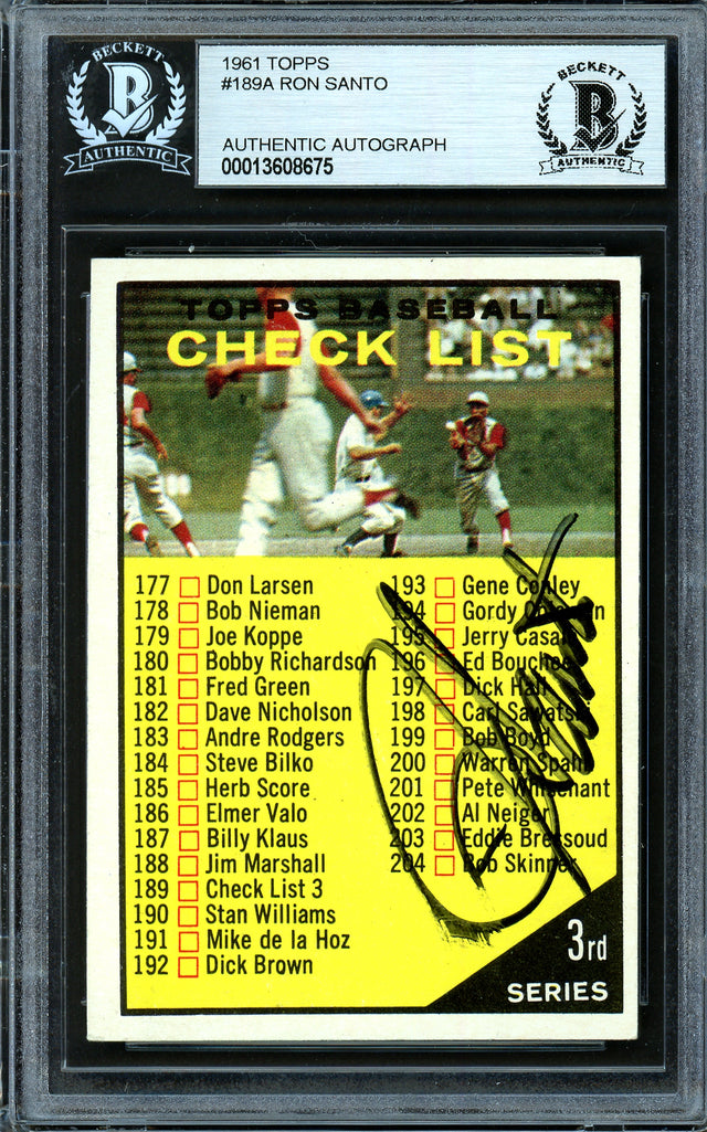 This 1961 Topps Checklist Card #189, hand-signed by Ron Santo, is a must-have for vintage baseball card collectors and Chicago Cubs fans. This rare piece of memorabilia is authenticated by Beckett Authentication Services (BAS) and securely encapsulated in their tamper-proof holder for long-term preservation.
