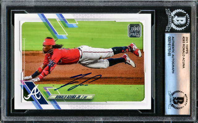 Own a piece of baseball history with this 2021 Topps Card #263, hand-signed by Ronald Acuña Jr., one of the most electrifying players in the game today. This rare collectible has been certified authentic by Beckett Authentication Services (BAS) and is securely encapsulated in their tamper-proof holder for long-term preservation.