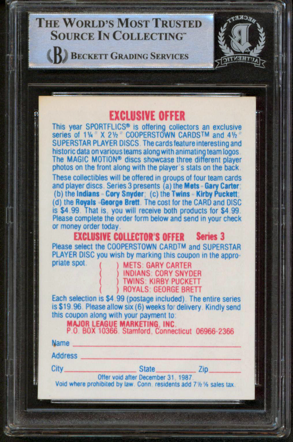 This Autographed 1987 Sportsflics Exclusive Collector's Offer Card has been personally signed by George Brett of the Kansas City Royals, one of baseball’s greatest hitters and a Hall of Famer. A must-have for serious collectors, this unique piece celebrates Brett’s legendary career and impact on the game. Each card is 100% authentic, slabbed and authenticated by Beckett Authentication Services (BAS) to ensure credibility and long-term value. Please note that we have multiples of this item, and while the photographs are representative, signature placement and size may vary—making each autograph truly one of a kind. Key Features:
