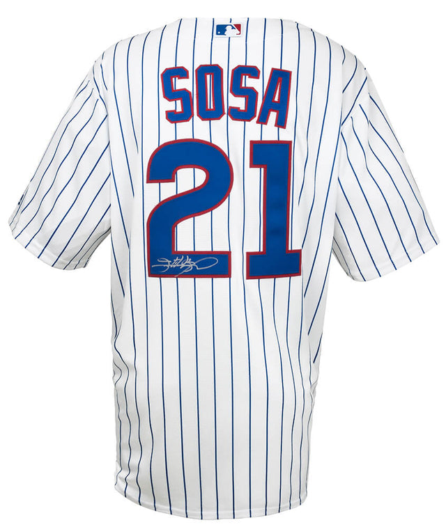 Own a piece of baseball history with this Sammy Sosa signed Chicago Cubs white pinstripe Majestic replica baseball jersey. A must-have for collectors and devoted Cubs fans, this autographed jersey celebrates the legacy of one of Chicago's most iconic sluggers.