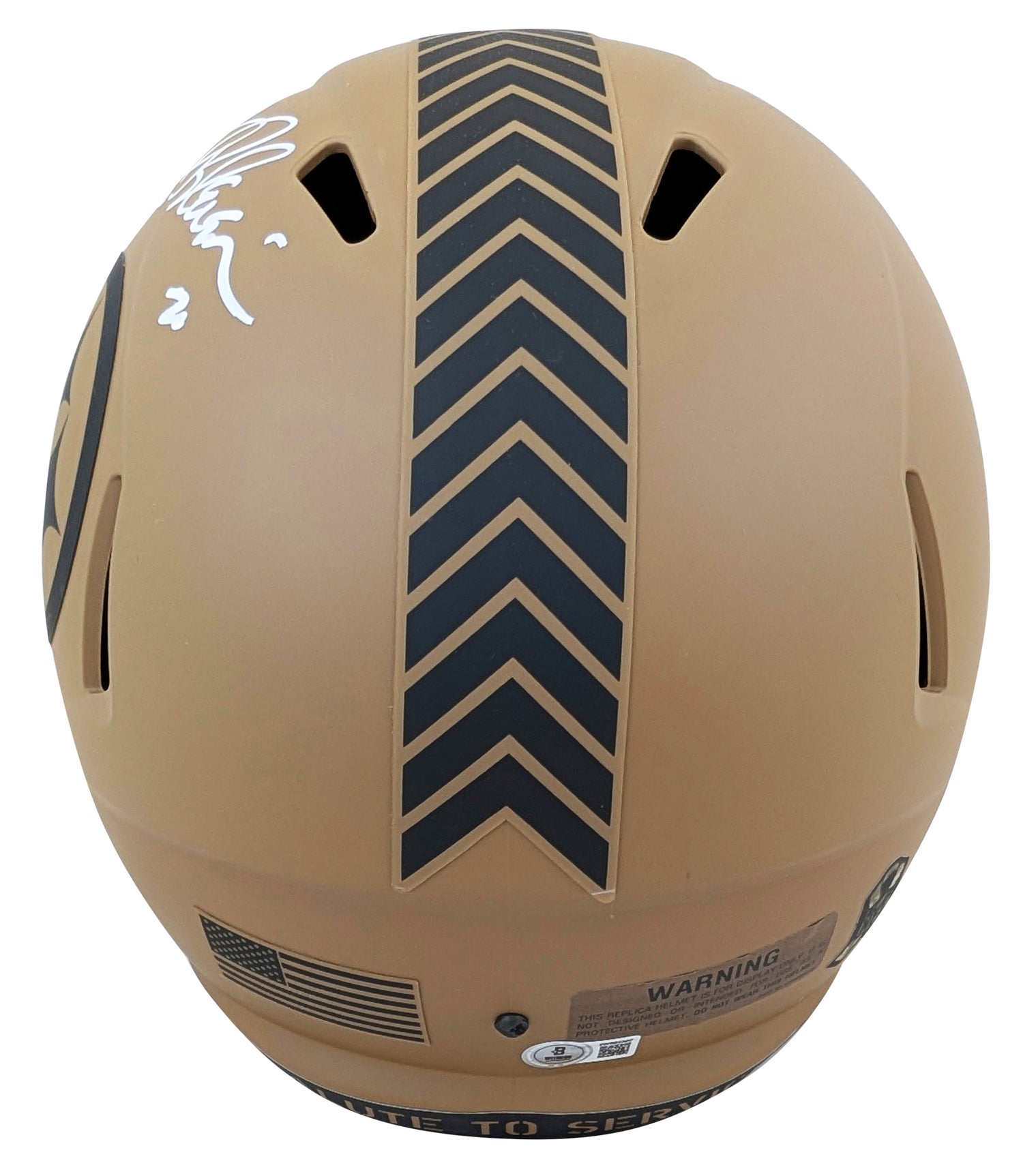 Celebrate both football glory and American valor with this iconic collectible — a Rocky Bleier Autographed 2023 Salute To Service II Riddell Full Size Speed Replica Helmet, signed by the Pittsburgh Steelers legend himself. This striking alternate helmet pays tribute to the U.S. Armed Forces and features a powerful personal inscription from Bleier: "U.S. Army (68-70), Purple Heart, Bronze Star." A true testament to a hero both on and off the field, this piece is a must-have for any serious Steelers fan or memorabilia collector.