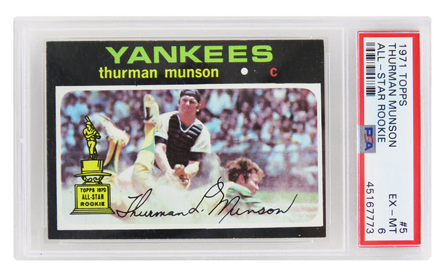 Own a piece of baseball history with this Thurman Munson New York Yankees 1971 Topps All-Star Rookie (2nd year) baseball card #5, graded EX-MT 6 (Excellent-Mint) by PSA and encapsulated for preservation. This collectible honors Thurman Munson, the legendary Yankees catcher and team captain, known for his leadership and impact on the game.