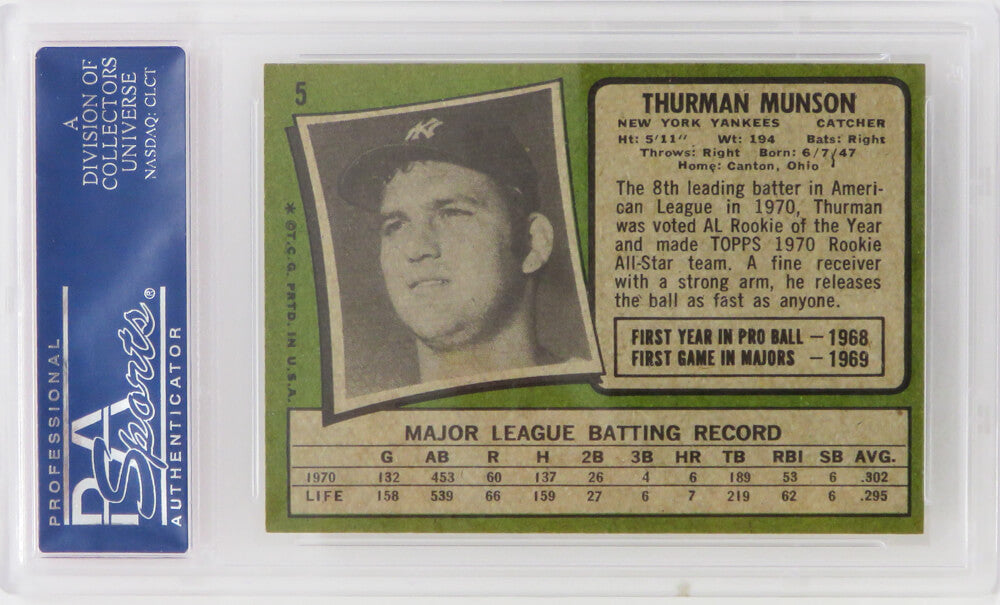 Thurman Munson (New York Yankees) 1971 Topps All Star Rookie Card #5 (2nd Year Card) - PSA 8 NM-MT (G)