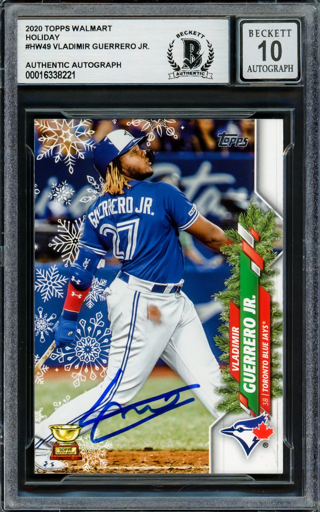 Own a piece of baseball history with this 2020 Topps Holiday Card #HW49, hand-signed by Vladimir Guerrero Jr., one of the game's brightest stars. This rare collectible has been graded Gem Mint 10 for signature quality by Beckett Authentication Services (BAS), ensuring its pristine condition and authenticity. Encapsulated in BAS’s tamper-proof holder, this item is protected for long-term preservation.