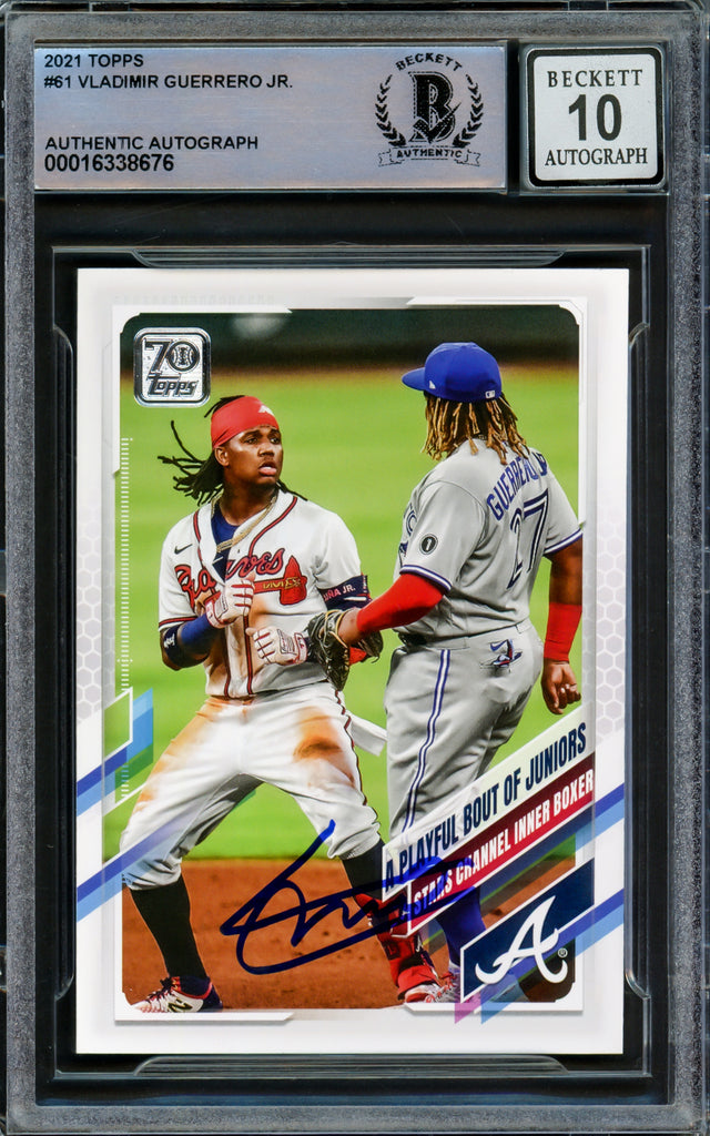 Own a piece of baseball history with this 2021 Topps Card #61, hand-signed by Vladimir Guerrero Jr., one of the brightest stars in Major League Baseball. This authentic collectible has been graded Gem Mint 10 for the signature by Beckett Authentication Services (BAS), ensuring its top-tier quality and authenticity.