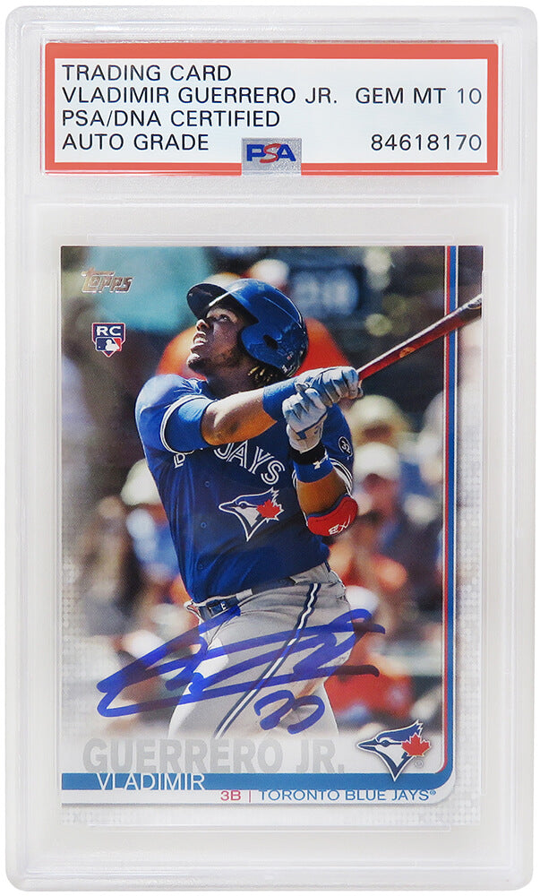 Own a piece of baseball history with this Vladimir Guerrero Jr. signed Toronto Blue Jays 2019 Topps Series 2 Rookie Card (No Number). A must-have for collectors and Blue Jays fans, this officially authenticated card showcases one of the game's most exciting young superstars. Each card is personally signed by Vladimir Guerrero Jr. and comes with his exclusive personal hologram on the back, ensuring authenticity. Professionally authenticated and encapsulated by PSA, this collectible features a GEM Mint 10 graded autograph, guaranteeing a flawless signature. Please note that only the autograph has been graded a 10 by PSA—the card itself is ungraded. Key Features: