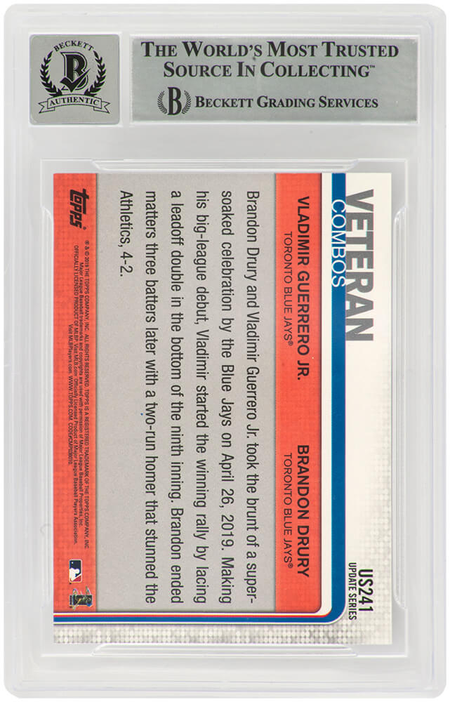 Vladimir Guerrero Jr. Signed Toronto Blue Jays 2019 Topps Update Rookie Baseball Card #US241 - (Beckett Encapsulated/ Auto Grade 10) is backordered and will ship as soon as it is back in stock.
