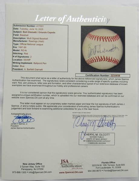 Bart Giamatti Orlando Cepeda Signed Auto Rawlings Baseball JSA LOA ZZ23038