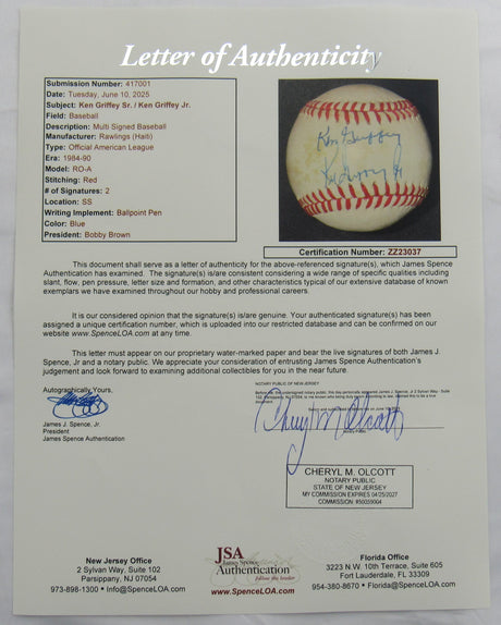 Ken Griffey Jr Ken Griffey Sr Signed Auto Rawlings Baseball JSA LOA ZZ23037
