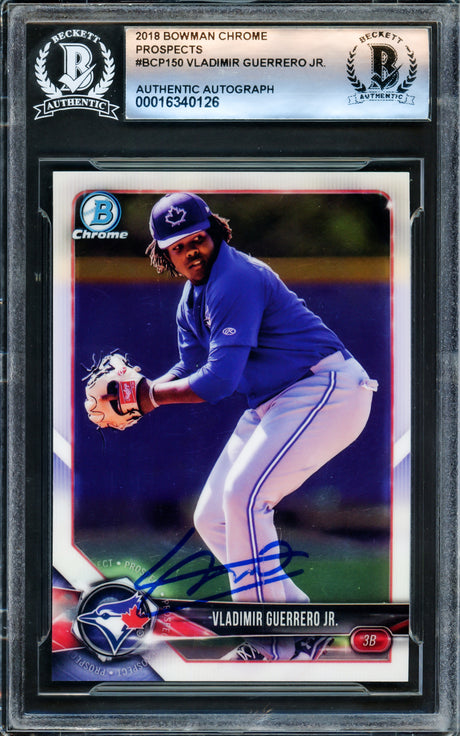 Very low stock (1 unit)$1,639Unit price /Unavailable Vladimir Guerrero Jr. Autographed 2021 Topps Card #61 Toronto Blue Jays Beckett BAS Stock #221561