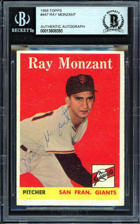 Very low stock (1 unit)$389Unit price /UnavailableRamon Ray Monzant Autographed 1958 Topps Card #447 San Francisco Giants Beckett BAS #13608393