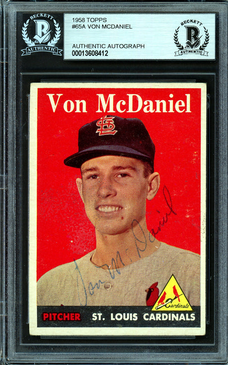 Very low stock (1 unit)$199Unit price /UnavailableVon McDaniel Autographed 1958 Topps Rookie Card #65 St. Louis Cardinals Beckett BAS #13608412