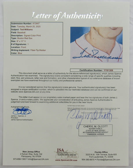 Ted Williams Signed Auto 9x11 Print JSA LOA ZZ81309