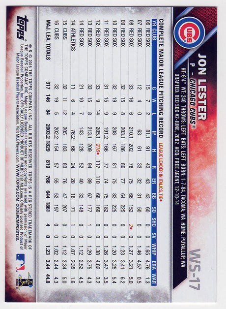 Jon Lester Signed Chicago Cubs 2016 Topps World Series Champions Baseball Card #WS17