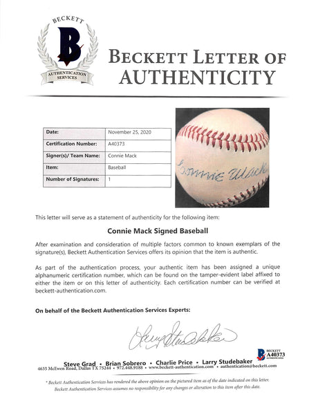 A's Connie Mack Authentic Signed Harridge Oal Baseball Autographed BAS #A40373