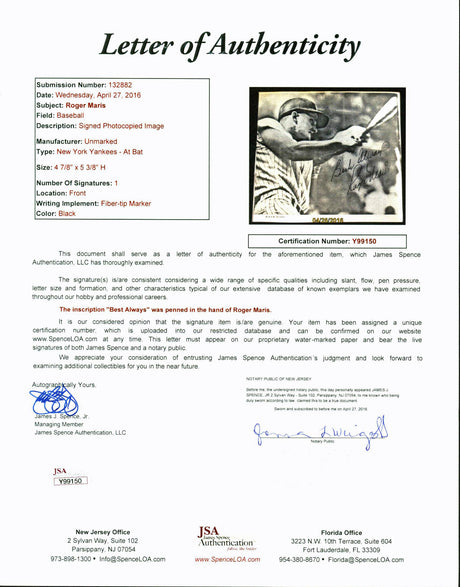Yankees Roger Maris "Best Always" Authentic Signed 4.8x5.5 Cut Photo JSA #Y99150