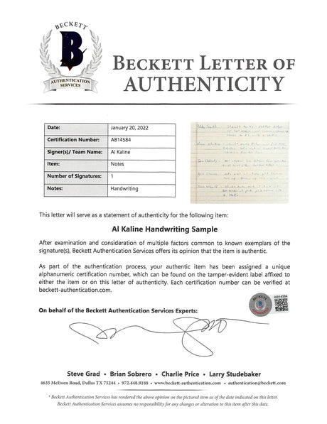 Tigers Al Kaline Authentic Signed 8.5x11 1998 Scouting Notes BAS #AB14584