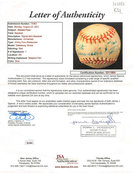 Red Sox Jimmie Foxx Signed Jimmie Foxx Restaurant Mini Baseball JSA #XX11864
