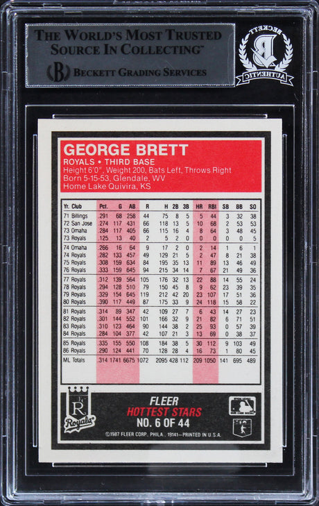 Royals George Brett Authentic Signed 1987 Fleer Hottest Stars #6 Card BAS Slab