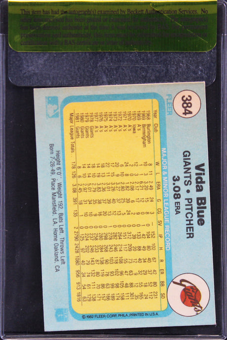 Very low stock (1 unit)$199Unit price /Unavailable Giants Vida Blue Authentic Signed 1982 Fleer #384 Card BAS #11392