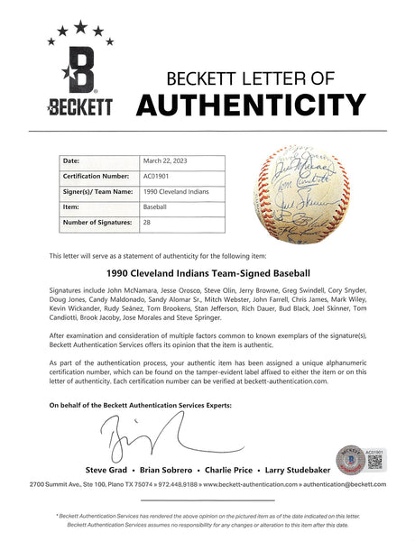 1990 Indians (28) Swindell, Alomar Sr., +26 Signed Oal Baseball BAS #AC01901