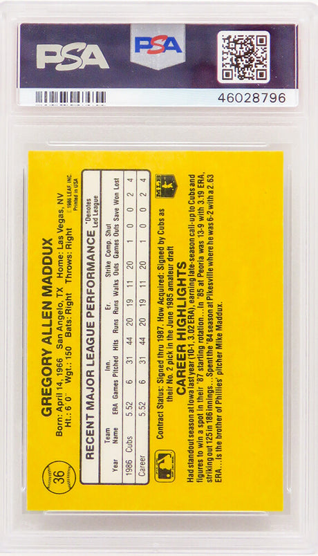 Greg Maddux (Chicago Cubs) 1987 Donruss Baseball #36 RC Rated Rookie Card - PSA 10 GEM MINT