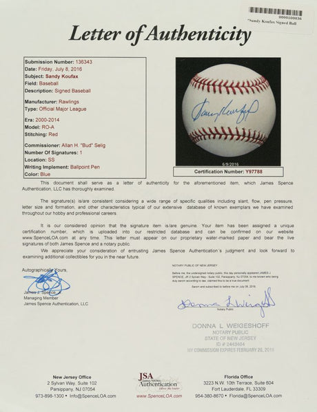 Sandy Koufax Brooklyn Dodgers Signed Official MLB Baseball JSA Y97788