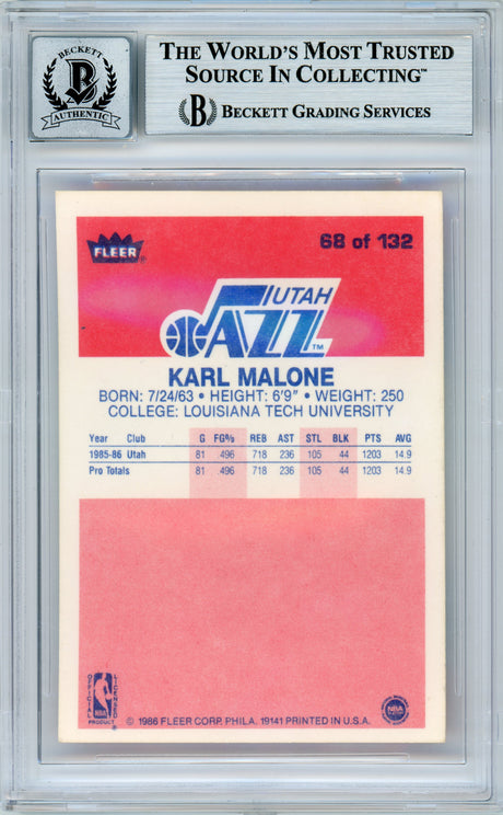 1986-87 Fleer #68 Karl Malone RC w/ "HOF" Insc. Utah Jazz BGS Autograph 10