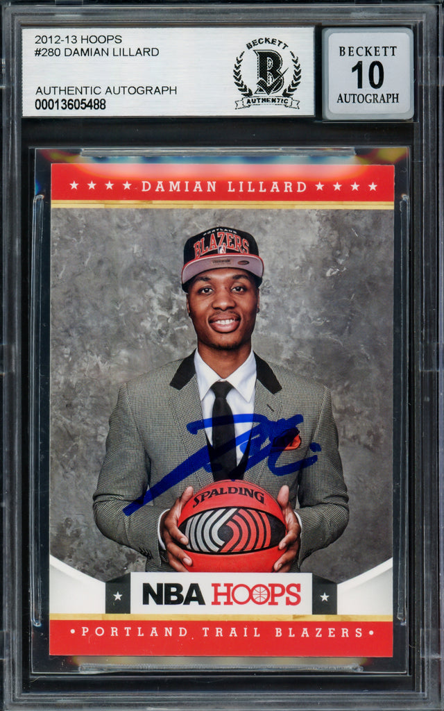 This is an authentic and highly collectible 2012-13 Panini Hoops Rookie Card #280 featuring Damian Lillard, one of the most dynamic point guards in NBA history. Hand-signed by Lillard himself, this rookie card is a must-have for any basketball fan or sports memorabilia collector looking to own a piece of the Portland Trail Blazers star’s early legacy. The autograph has been professionally evaluated and received a perfect Gem Mint 10 grade from Beckett Authentication Services (BAS), ensuring top-tier quality and authenticity. The card comes securely encapsulated in a tamper-proof holder for long-term preservation and display.