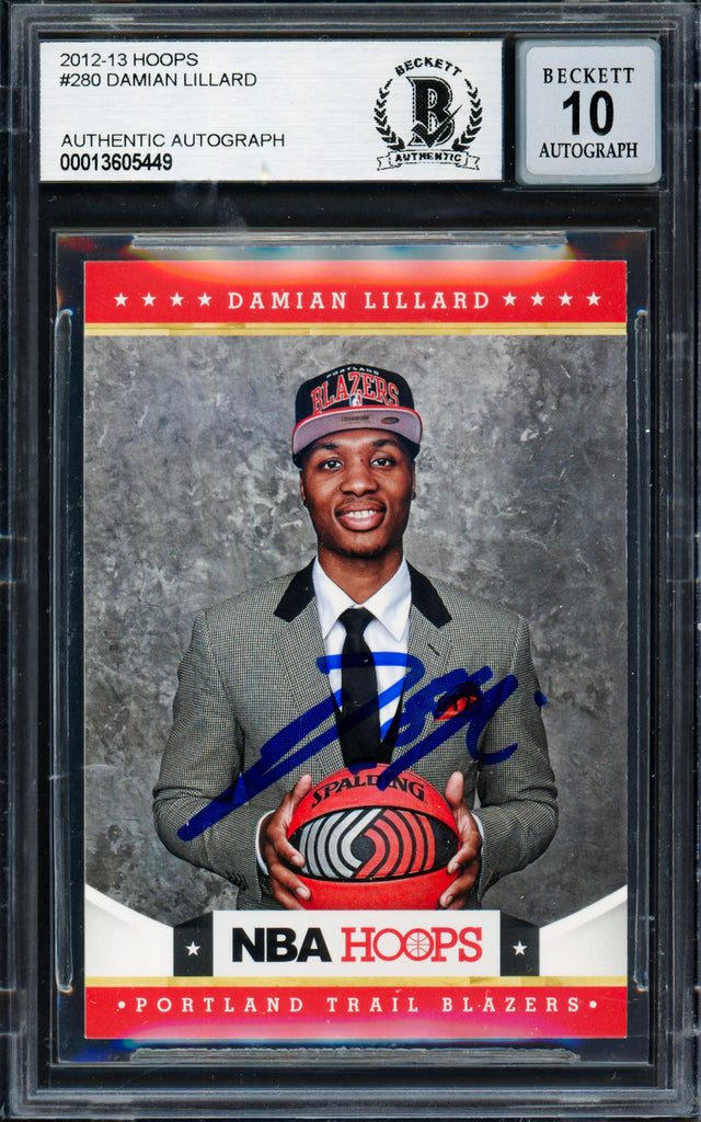 Autographed, signed memorabilia—Collector Grade: Damian Lillard 2012-13 Panini Hoops Rookie Card #280 with Beckett BAS Auto Grade Gem Mint 10, sealed in BAS tamper-proof holder. Lillard captured the 2012-13 NBA Rookie of the Year award and has since become a multiple-time All-Star and All-NBA guard known for clutch “Dame Time” heroics. He was also named to the NBA’s 75th Anniversary Team, underscoring his status among the elite of his era.