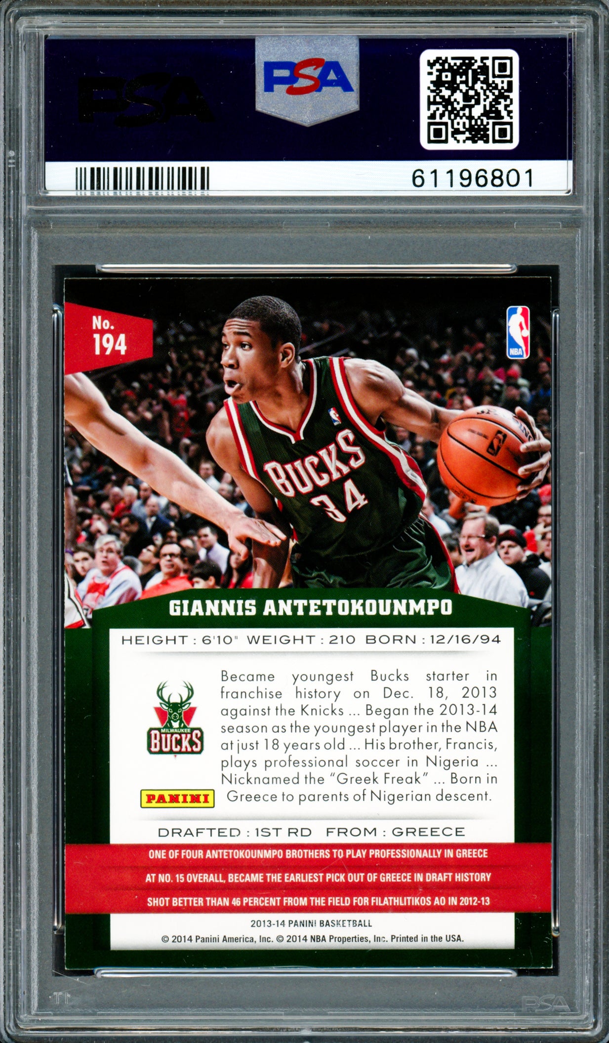 Collector-Grade, PSA/DNA authenticated autographed and signed memorabilia—this 2013 Panini Rookie Card #194 features Giannis Antetokounmpo’s autograph, graded Mint 9 by PSA/DNA and encapsulated in their tamper-proof holder. A two-time NBA MVP (2019, 2020) and the 2021 NBA Champion and Finals MVP, Giannis led the Milwaukee Bucks to their first title in 50 years. He’s also a multiple-time All-NBA and All-Star selection, and the 2020 Defensive Player of the Year.