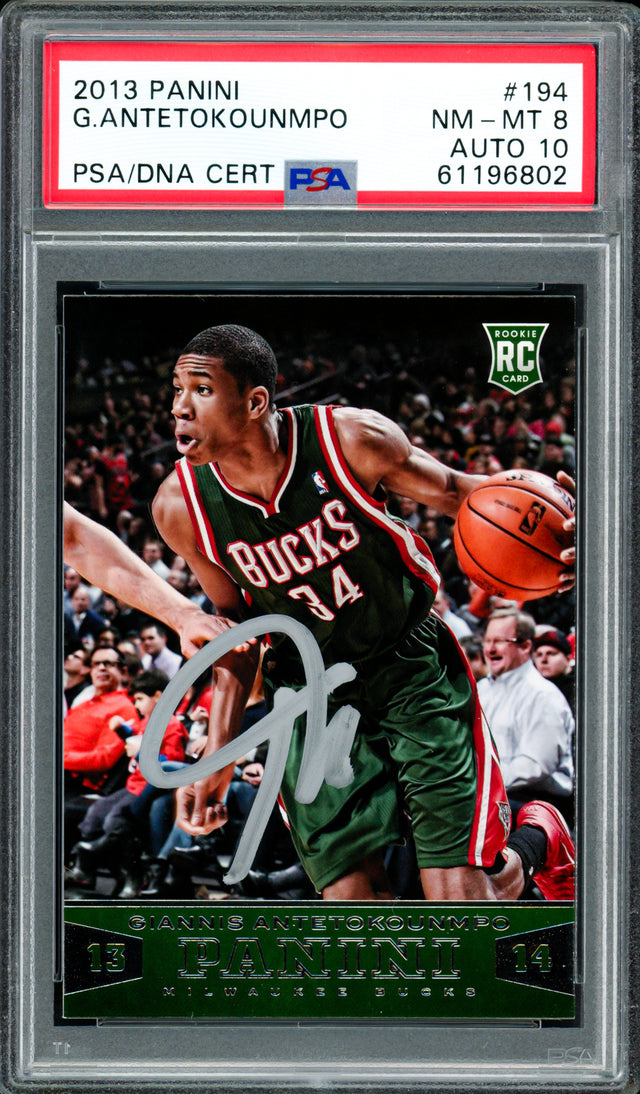 Collector Grade PSA/DNA authenticated autographed rookie—this signed Giannis Antetokounmpo memorabilia is his 2013 Panini Rookie Card #194, graded PSA 8 with a PSA/DNA Gem Mint 10 autograph in a PSA tamper-proof holder. Giannis led the Milwaukee Bucks to the 2021 NBA title and captured Finals MVP. He’s a two-time NBA MVP (2019, 2020), the 2020 Defensive Player of the Year, and a regular All-NBA and All-Star selection.