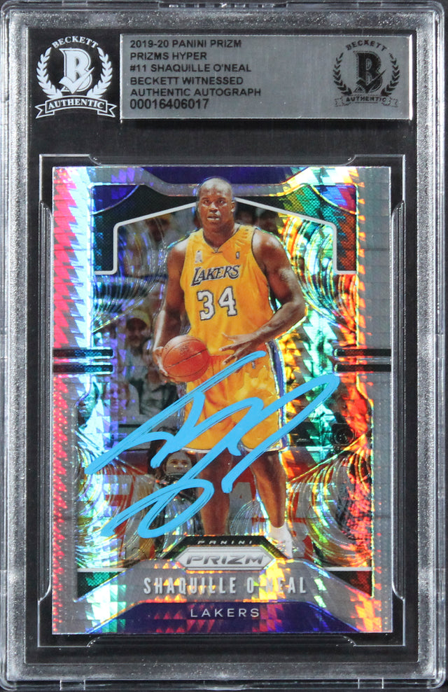 Own a piece of basketball history with this Autographed 2019 Panini Prizm Prizms Hyper #11 Card, personally signed by Shaquille O'Neal of the Los Angeles Lakers. A true collector's item, this card is 100% authentic and has been professionally slabbed and authenticated by Beckett Authentication Services (BAS).