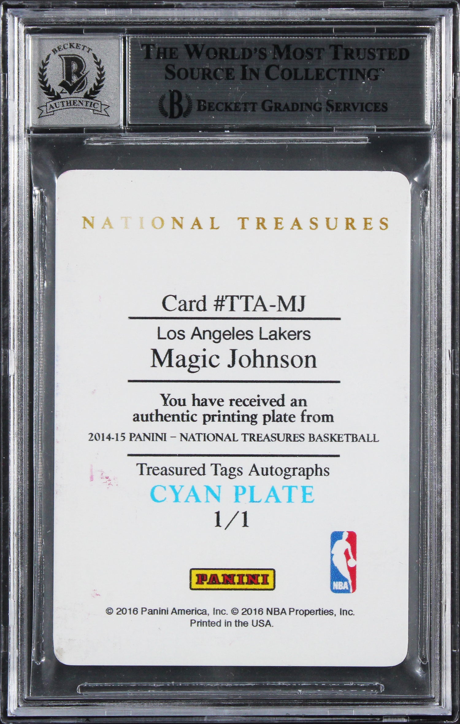 Own a remarkable piece of basketball history with this Autographed Auto Graded Gem Mint 10! 2014 National Treasures Treasured Tags Autographs Printing Plates Cyan #TTAMJ Magic Johnson Card, personally signed by Los Angeles Lakers legend Magic Johnson with the special inscription "HOF 02." This ultra-rare 1-of-1 collectible merges elite grading with iconic sports heritage, making it a centerpiece for any serious memorabilia collection.