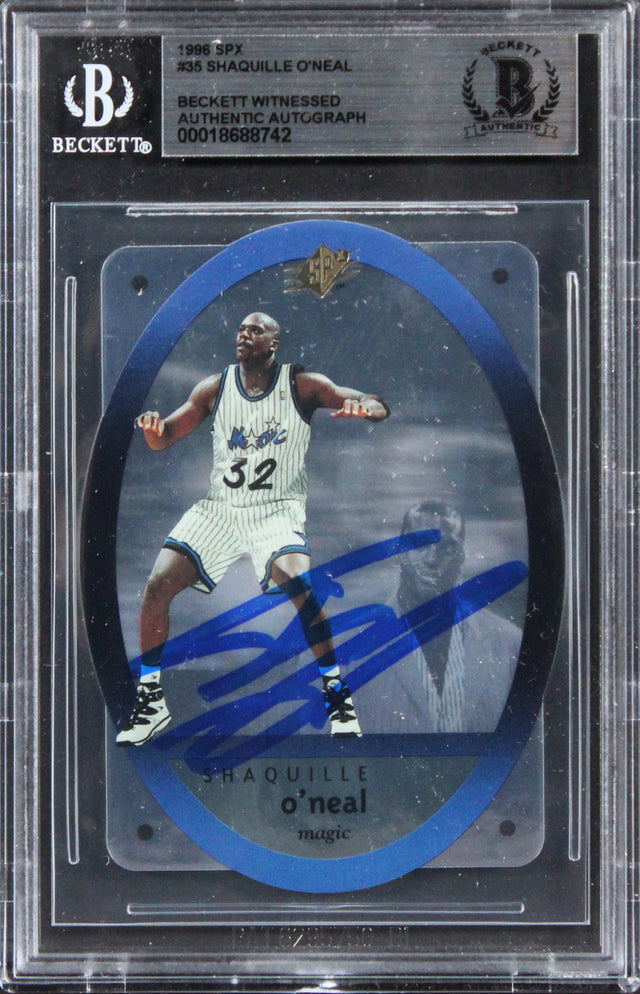 Own a legendary piece of basketball history with this Autographed 1996 SPX #35 Shaquille O'Neal Card, personally signed by the NBA icon during his time with the Orlando Magic. As one of the most dominant centers in basketball history, Shaquille O'Neal made an indelible mark on the game—and this card captures a pivotal era in his career, just as he was becoming a household name in the mid-1990s. Authenticated by Beckett Authentication Services, this rare collectible is securely slabbed for long-term preservation and ultimate display impact.